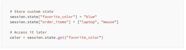 ADK also lets you store custom data in the session — things like user preferences, shopping carts, or workflow progress.