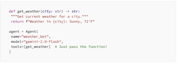 ADK inspects your function's signature and docstring automatically. No schemas to write. No decorators required. Your existing Python code becomes an agent tool with zero modifications.